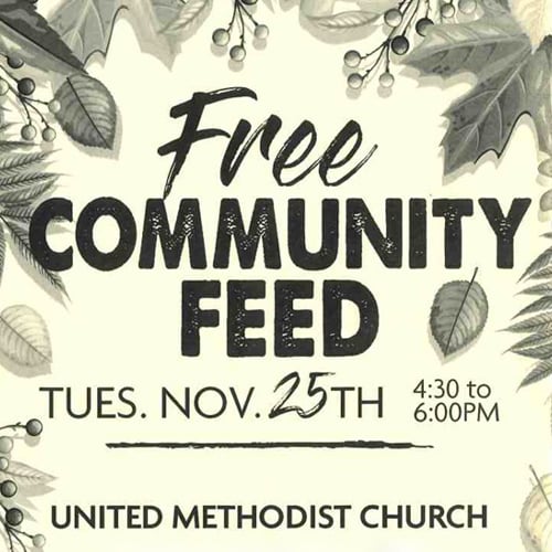 United Methodist Church is hosting a FREE Community Feed Tuesday, November 25th • 4:30pm - 6:00pm Brats & Hot Dogs Chips Fruit Cups Lemonade &am...